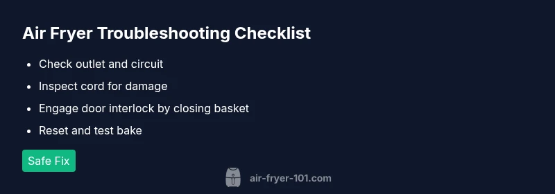If your air fryer not working, the first question is whether the appliance even powers up. According to Air Fryer 101, most power-on failures are electrical or safety-related. A dark display, no beep, or no response usually points to a simple electrical issue rather than a failed cooking element. Start with the easiest checks: confirm the outlet has power by plugging in another device, inspect the power cord for visible wear or damage, and reseat the plug firmly. If the outlet is live and the cord looks intact, reset the circuit breaker or fuse if you suspect a tripped circuit in the kitchen. Then verify the door interlock is functioning: the unit should only heat when the door or basket is properly closed since a safety interlock will prevent power if the latch is unsettled. If after these checks the air fryer still won’t turn on, move to a different outlet or try a different appliance to rule out supply issues.