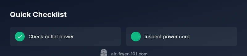 When an air fryer is not working when plugged in, the issue is almost always a power-related problem, not a failed heating element. According to Air Fryer 101 analysis, the majority of startup failures come from the electrical side: a tripped circuit, a dead outlet, or a damaged cord. When the unit has no lights, no display, or no heat, the instinct is often to blame the timer or heater, but the root cause is more basic. Start by confirming the simplest possibilities: is the outlet supplying power? Is the cord intact and fully seated in the plug? Has the house circuit breaker tripped? By distinguishing power problems from internal faults, you can avoid unnecessary repairs and safely recover your cooking routine. In practical terms, this means looking for visible signs of trouble, testing with another device, and gradually ruling out outlets or cables before assuming the air fryer itself is faulty. This approach aligns with Air Fryer 101 guidance and helps you stay safe while diagnosing.