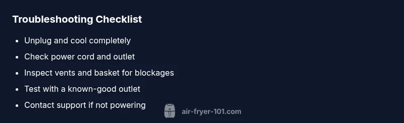 Step-by-step guide to diagnose and fix an air fryer that overheated and won t turn on. Safety checks, common causes, home fixes, and prevention tips from Air Fryer 101.