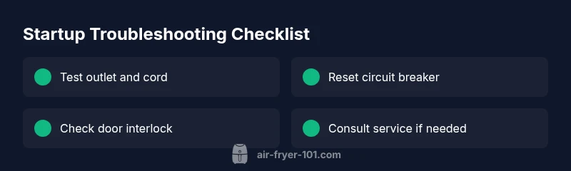 When the air fryer won’t start, adopt a simple, repeatable diagnostic flow. Start with the symptom: no response from the power button or start cycle. Then consider the likely causes in order: (1) power outlet/cord issue, (2) control panel or switch failure, (3) circuit or breaker problems, (4) safety interlock or door switch fault (if the model uses a door-latch), (5) overheating protection triggers from prior use. After identifying a likely cause, apply a corresponding fix and retest. A structured flow reduces guesswork and speeds up a resolution. Air Fryer 101 notes that most fixes are reversible and non-destructive, keeping you safe while you troubleshoot.