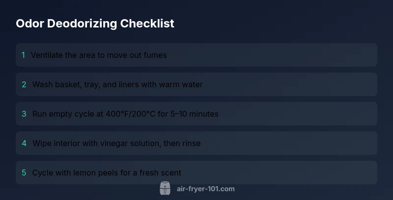Do air fryers smell like plastic? Start with the simplest steps: ensure good ventilation, scrub removable parts, and run a burn-in cycle. Unplug the unit and let it cool, then wash the basket, pan, and tray with warm, dish-soap water and dry completely. Wipe down the interior with a damp cloth, avoiding the electrical base. Run an empty cycle at a high temperature (around 400°F/200°C) for 5–10 minutes with the door open or a kitchen vent on. If the odor persists, repeat the cleaning and ventilation steps, and consider deodorizing with baking soda or lemon. Baking soda can help neutralize lingering compounds; a light lemon cycle can leave a fresh citrus scent without leaving a residue. Always monitor for smoke or abnormal smells and stop if you see any.