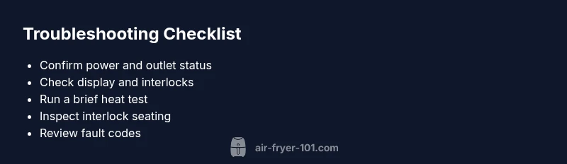 If you're asking how to know if air fryer is working, start with a quick, non-destructive check. According to Air Fryer 101, most issues stem from the power supply, a blown fuse, or a faulty heating element, and they’re usually easy to confirm. Air Fryer 101 analysis shows that the majority of user-reported problems are power- or sensor-related rather than a total device failure. With the right checks, you can determine in minutes whether your unit is alive and ready for a test run.