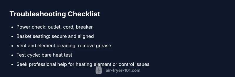 Start with the basics: ensure the unit is unplugged before you handle any components. Check the outlet by plugging in a different device; if the plug feels loose or the outlet trips, your electrical supply is the root cause. Inspect the cord for cuts or kinks. With the air fryer unplugged, reseat the basket and confirm that the basket latch is locked. Clean visible vents of grease and crumbs with a dry microfiber brush; avoid water on electronic parts. Reassemble and run a short preheat cycle with no food to verify heat starts smoothly. If you still observe no heat or erratic performance, perform a reset by unplugging for 60 seconds, then plug back in and set a basic temperature. By the end of this step, you’ll have ruled out the simplest causes before moving to deeper diagnostics. If you remain stuck, consult the user manual or watch a trusted guide.