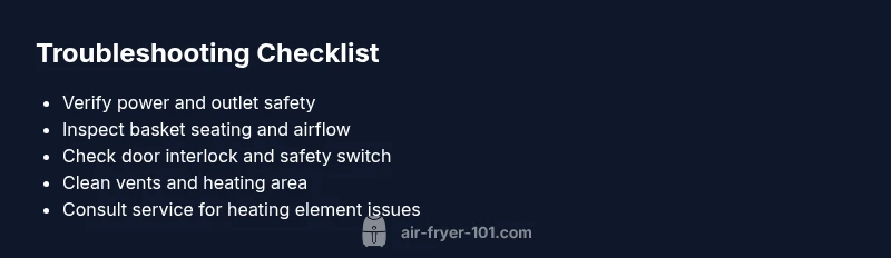 Most air fryer problems stem from power, temperature sensing, or airflow. Start with a quick check: ensure it’s plugged in, the outlet works, and the built-in timer is set correctly. If the unit still won’t heat, inspect the door latch and thermostat for faults. Air Fryer 101 notes that safe, stepwise troubleshooting prevents unnecessary part replacements and keeps your healthy cooking on track.
