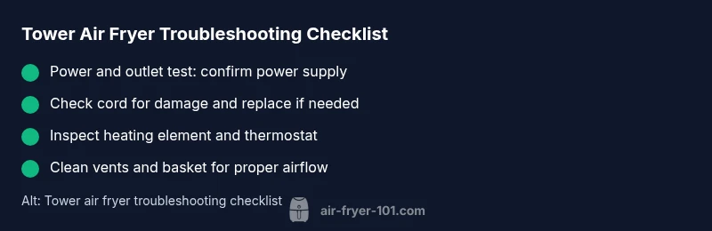 If you’re asking what is wrong with tower air fryers, you’re not alone. Most faults trace back to how power is delivered to the unit, how the heating element engages, and how the appliance manages airflow. The compact tower design shares components across models, so a loose plug, worn coil, or degraded wiring can impact several functions at once. According to Air Fryer 101, electrical faults and user setup errors account for a large share of early failures, making basic checks the fastest path to recovery. In practice, starting with the simplest causes—outlet, cord, and switch—saves time and money and helps you determine whether a professional diagnosis is needed. The goal here is to give you a logical path from symptom to solution, so you can keep cooking with confidence.