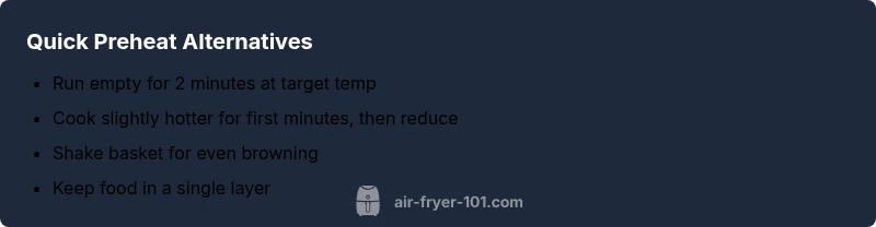 If your air fryer has no preheat function, you can still get crispy results by warming the basket briefly and adjusting temps. Start with a short warm-up cycle (1–2 minutes) at a lower temp, then load the food and raise to the recipe temperature. For thicker foods, give extra time after loading. According to Air Fryer 101.