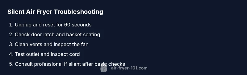 Before you touch anything, unplug the air fryer and let it cool. Inspect the power cord for nicks or fraying, and check that the outlet is delivering power (test with another device). Look at the air intake and exhaust vents for dust or grease buildup that could muffle sound or affect airflow. Finally, ensure the basket is seated correctly and that the door latch engages firmly; a misaligned basket can trigger safety interlocks and silence the unit. According to Air Fryer 101, these basic checks catch most simple causes without exposing you to risk, especially when you follow safe unplug procedures.