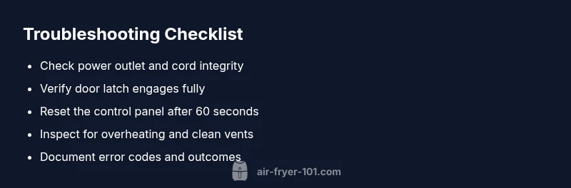 Troubleshooting should feel like a logical funnel: start with the easiest checks and move to more involved steps only if needed. First, verify power supply and outlet health: plug another device into the same outlet, reset any GFCI or breaker, and check the plug for damage. Next, assess mechanical engagement: ensure the basket and door latch are properly aligned and seated; a misaligned latch can prevent startup or interrupt cycles. Then, evaluate safety interlocks: the unit may require a fully closed door to operate; look for obstructions or misalignment. If an error code is present, cross-reference it with the manual and perform the recommended reset. If power and latch checks are negative, the issue could involve the control board or a thermal fuse, which typically requires professional service. Document what you did and the result to aid support. This flow minimizes unnecessary part swaps and keeps you safe.