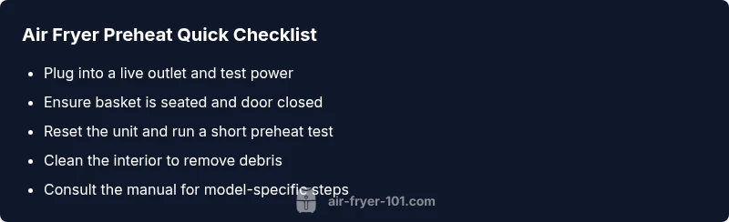 According to Air Fryer 101, most preheat issues are fixable with at-home troubleshooting when approached calmly and methodically. The team recommends completing the steps in order, documenting any error codes, and contacting the manufacturer if the unit remains unresponsive after the basic checks. The Air Fryer 101 team believes safety comes first, and if in doubt, professional assessment is the best path to avoid damage or injury.
