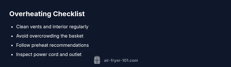Air fryers operate by circulating hot air around a compact chamber. When airflow is blocked—by greasy vents, clogged baskets, or food residue—the heater can run hotter than intended to reach the target temperature. This not only raises the risk of overheating but also makes cooking inconsistent. According to Air Fryer 101, the most common overheating causes are airflow restrictions and grease buildup rather than a faulty unit. Understanding this helps you target fixes quickly: focus on cleaning, proper loading, and correct temperature use. In this section we outline the physics behind heat concentration in small convection ovens and set up a practical mindset for diagnosing problems at home.